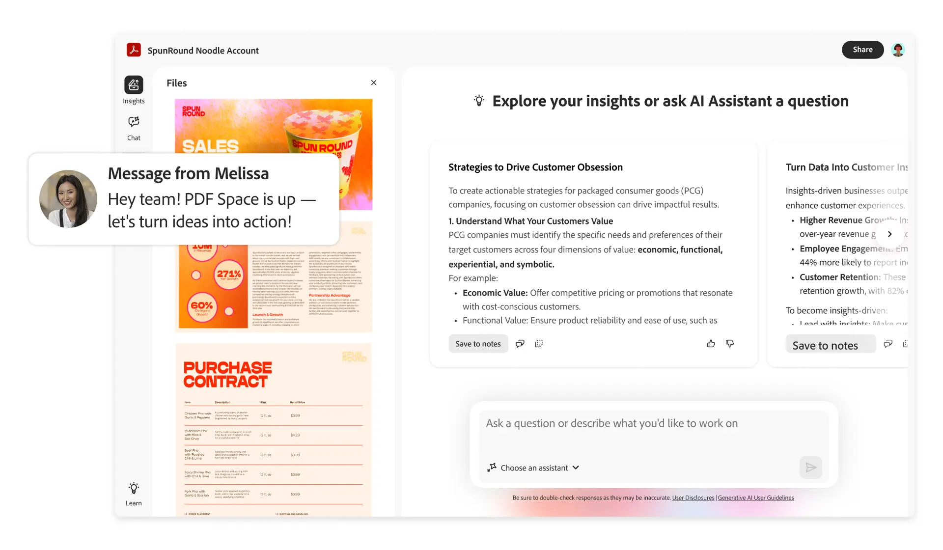 Crear, editar, firmar y compartir archivos PDF y contratos. Usa herramientas de IA para descubrir información clave más rápido y generar contenido de forma más eficiente. Además, cuenta con la automatización para optimizar los flujos de trabajo, acelerar las aprobaciones e impulsar la colaboración a escala.